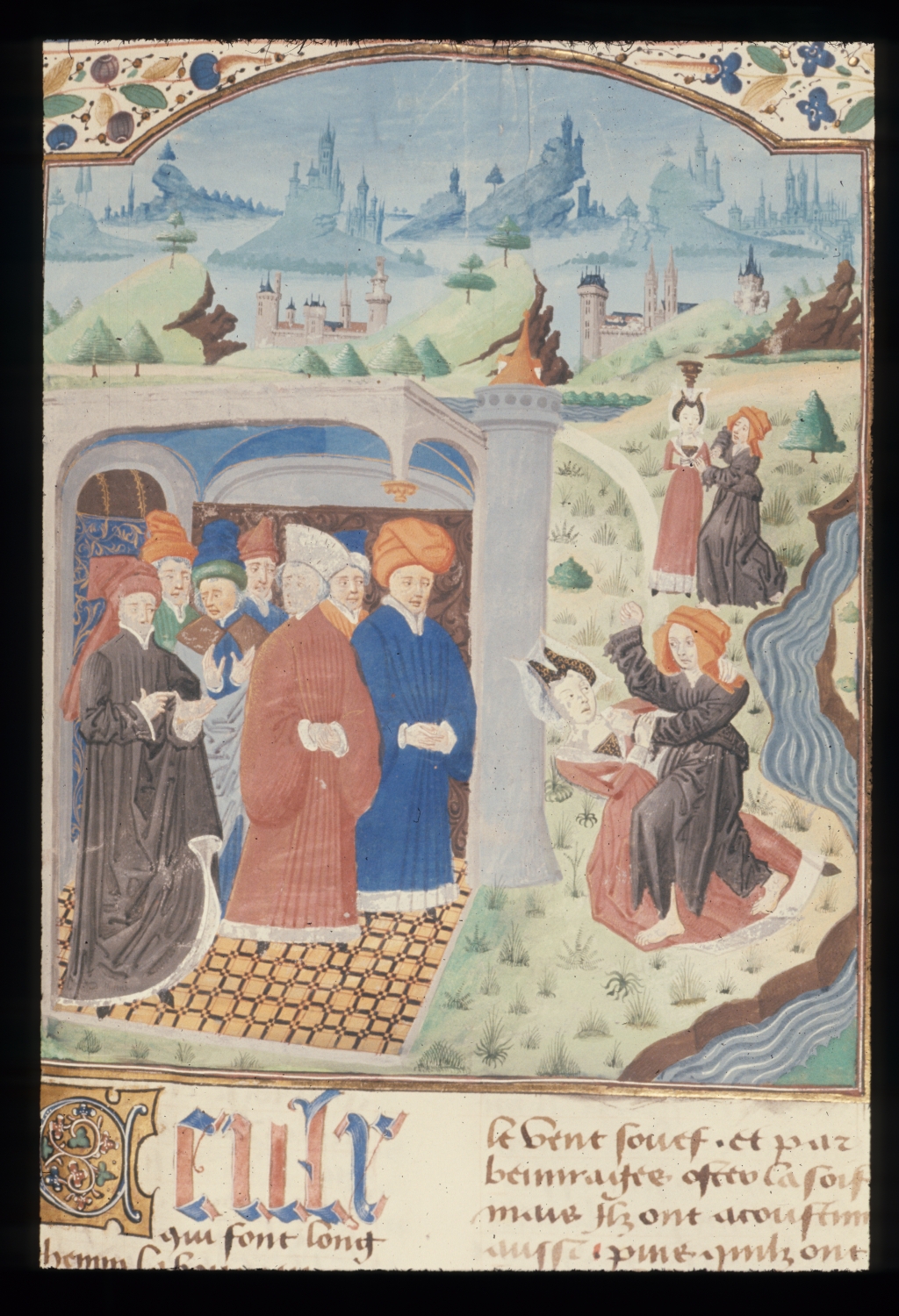 Scuola di Loyset Liédet (1470 c.), Andalò del Negro tiene una lezione; la Povertà lotta con la Fortuna