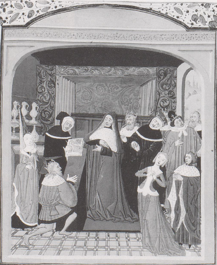 Londra, British Library, Add. 11696, f. 230r. L'autore Giovanni Boccaccio (?) intento a scrivere un libro; al centro un uomo in piedi (Francesco Petrarca ?); sette re, una regina e una dama dolenti.