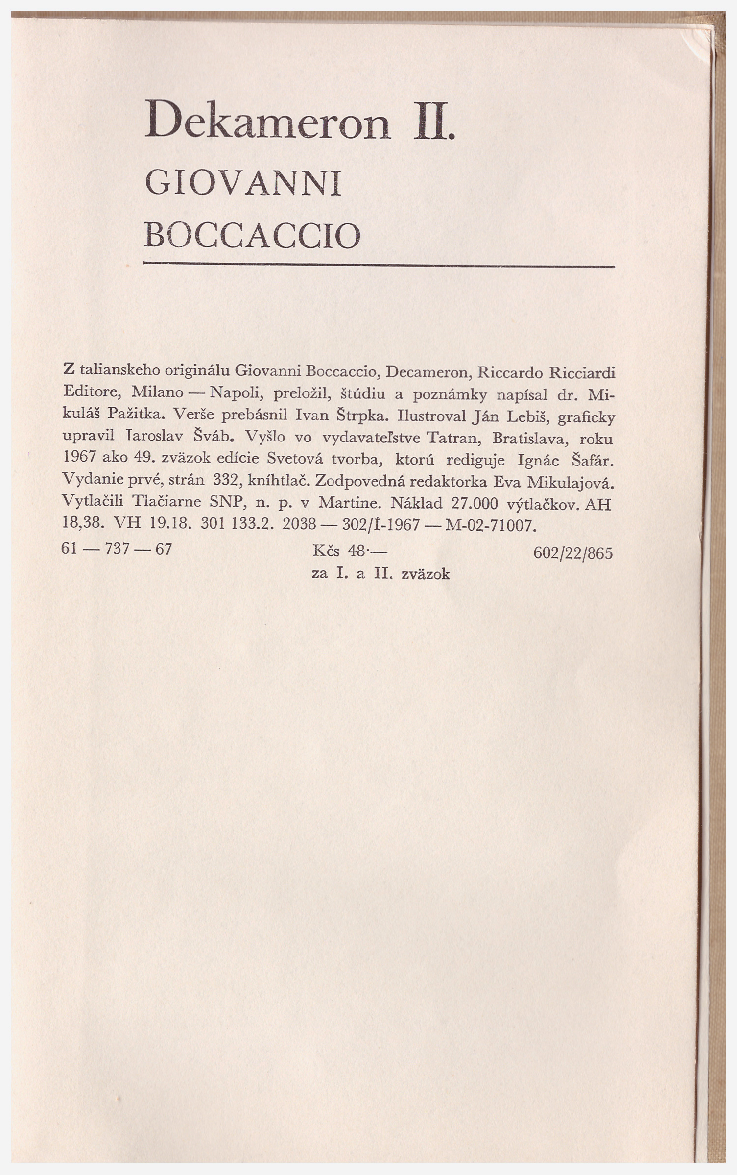 Dekameron. II / preložil, doslov a poznámky napísal dr. Mikuláš Pažitka ; ilustroval Ján Lebiš