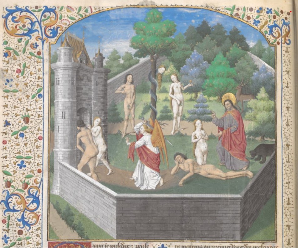 Londra, British Library, Add. 35321, f. 2v. Dio crea Eva dalla costola di Adamo; Eva, tentata dal serpente, coglie il frutto proibito dall'albero; un angelo armato di spada caccia Adamo ed Eva dal Paradiso Terrestre.