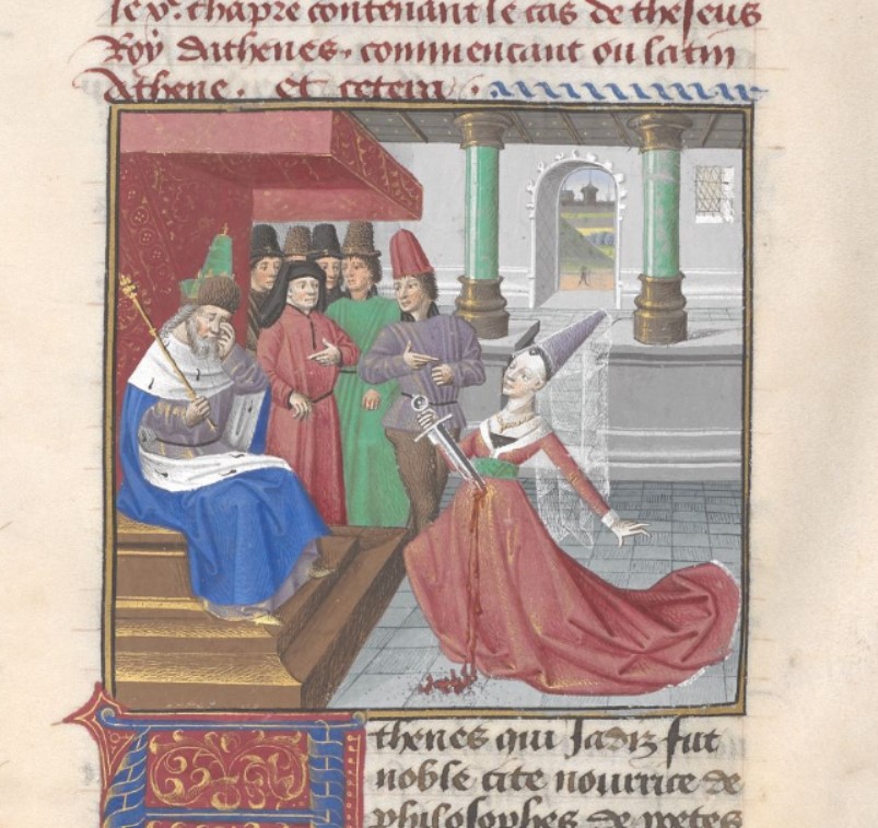 Londra, British Library, Add. 35321, f. 14r. Fedra si suicida trafiggendosi con una spada dinanzi a Teseo, il quale ne piange la morte.