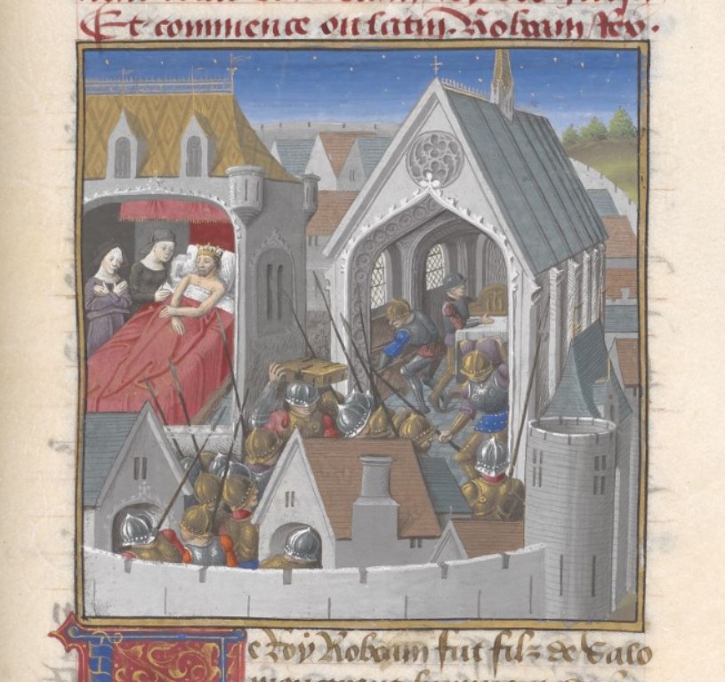 Londra, British Library, Add. 35321, f. 37r. Re Roboamo giace in fin di vita nel letto, assistito da due donne; il tempio di Gerusalemme viene saccheggiato dai soldati.