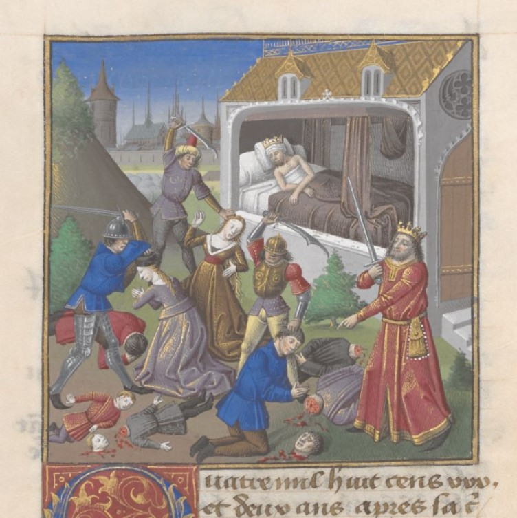 Londra, British Library, Add. 35321, f. 105v. Artaserse ordina il massacro dei suoi figli e delle loro mogli; Artaserse giace a letto morente.