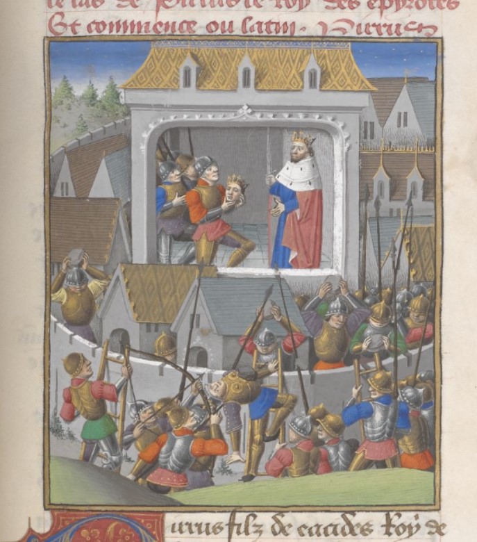 Londra, British Library, Add. 35321, f. 140r. L'esercito di Pirro viene respinto sulle mura di Argo; Antigono riceve la testa di Pirro.