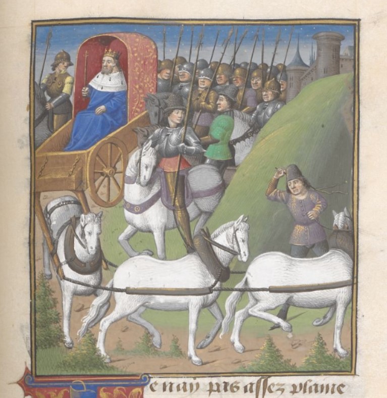 Londra, British Library, Add. 35321, f. 155r. Siface viene portato prigioniero a Roma su un carro.