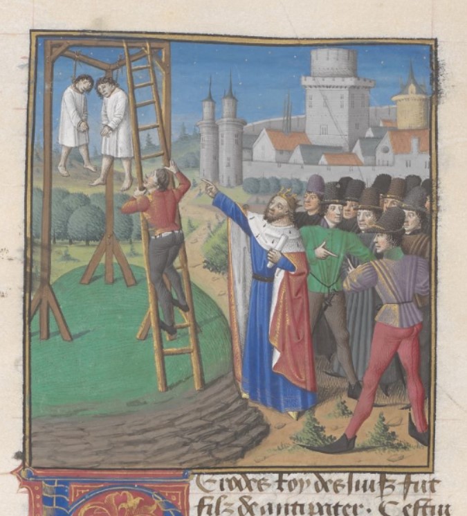 Londra, British Library, Add. 35321, f. 221r. Erode ordina l'impiccagione dei figli Aristobolo e Alessandro.