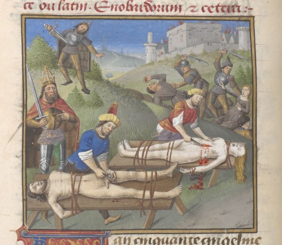 Londra, British Library, Add. 35321, f. 230v. Nerone osserva mentre Sporo viene castrato e Agrippina viene squartata; un uomo e una donna vengono assassinati da alcuni soldati; Nerone si trafigge con una spada.