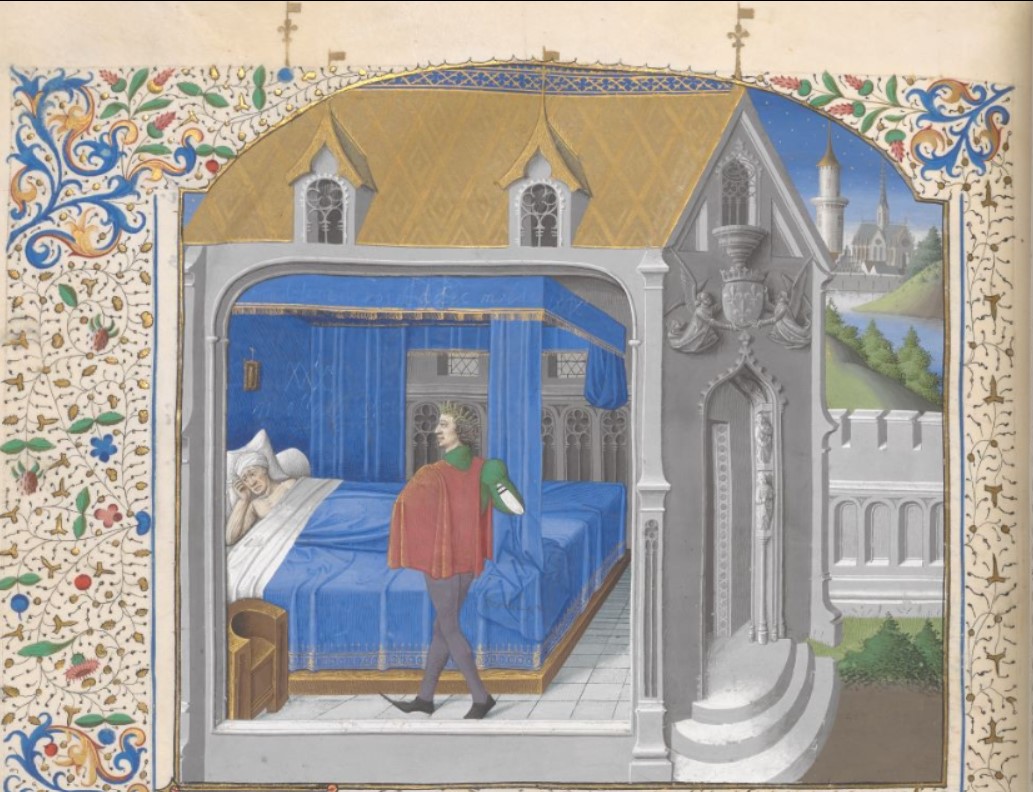 Londra, British Library, Add. 35321, f. 247v. Francesco Petrarca appare in sogno a Giovanni Boccaccio.