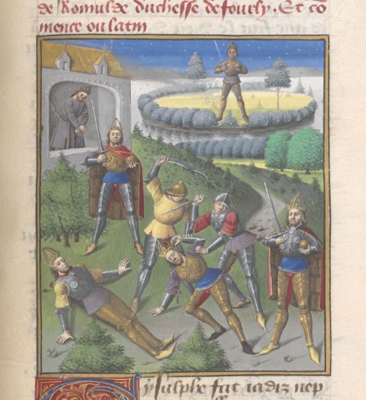Londra, British Library, Add. 35321, f. 291r. Sei imperatori vengono torturati (l'illustrazione rappresenta le sfortune di nobili e imperatori).