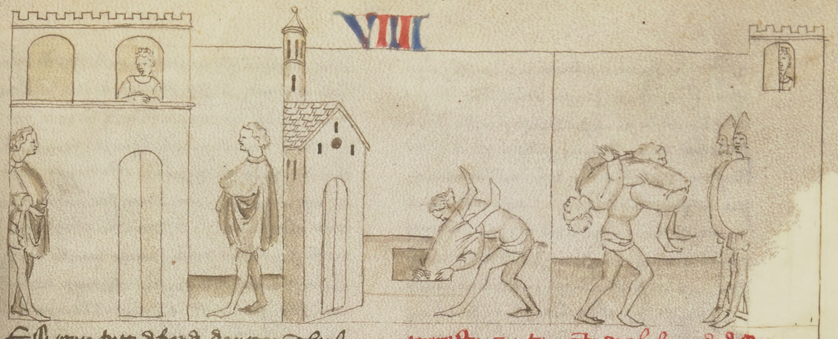 Miniatore fiorentino (1360-1390), Francesca osserva dalla finestra Rinuccio e Alessandro; Alessandro dissotterra il corpo di Scannadio; Rinuccio, trasportando Alessandro sulle spalle, incontra dei gendarmi