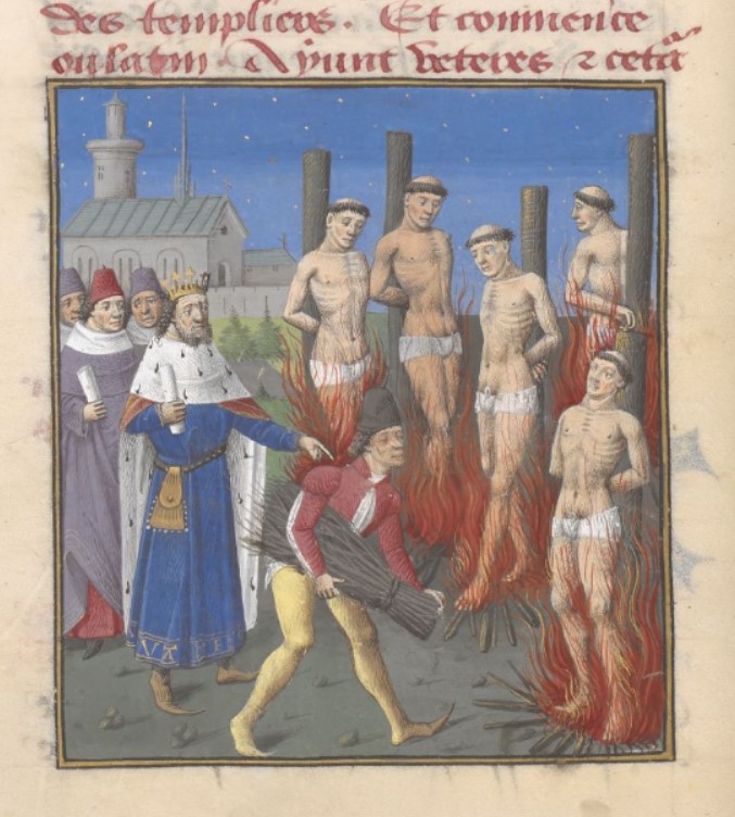 Londra, British Library, Add. 35321, f. 309v. Filippo il Bello, accompagnato da tre giudici, fa ardere i cavalieri Templari sul rogo.