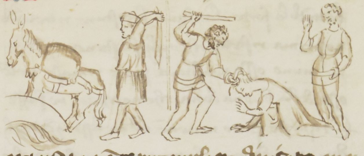 Miniatore fiorentino (1360-1390), Un mulattiere batte la propria bestia recalcitrante; Giosefo batte la propria moglie
