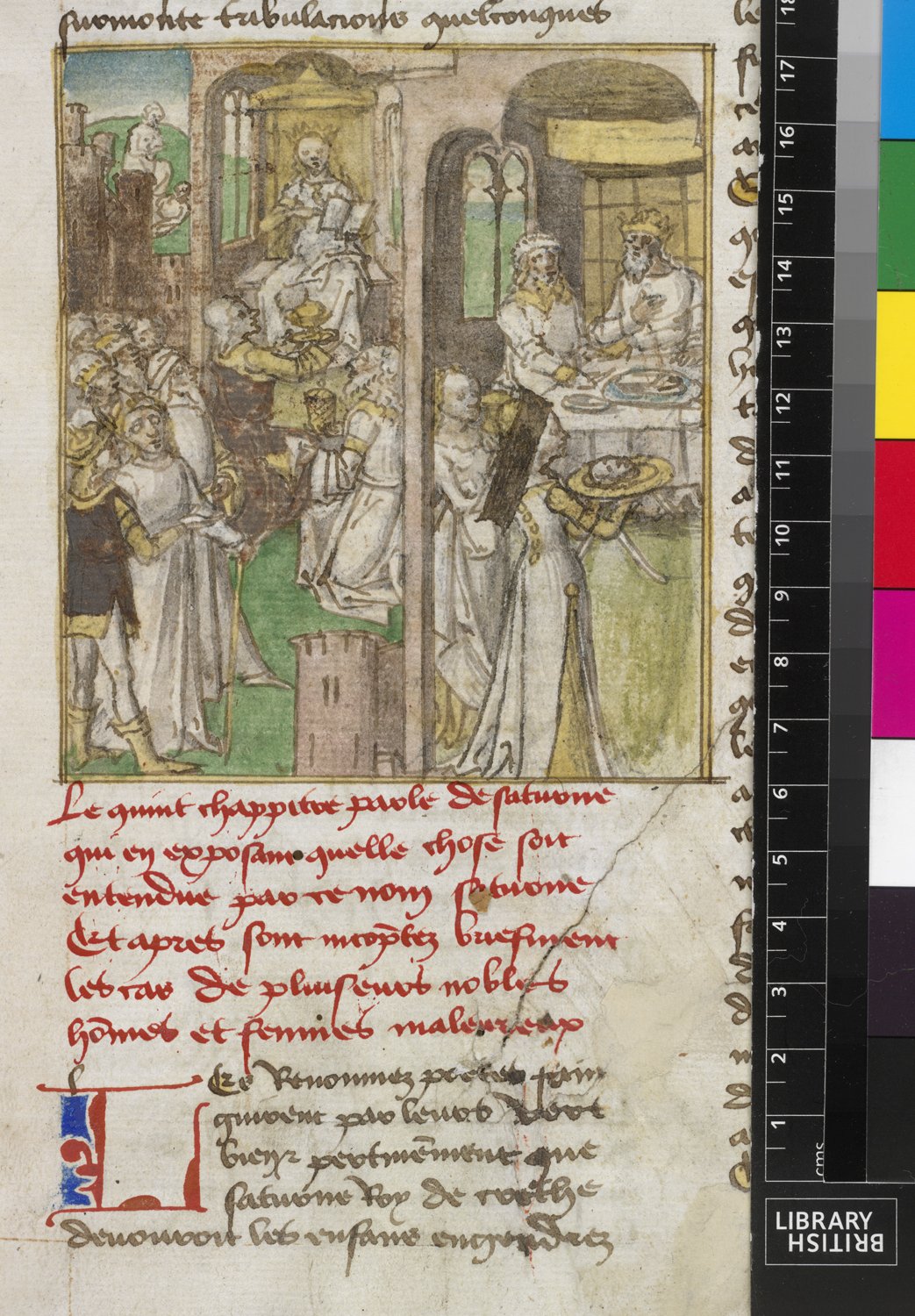 Londra, British Library, Harley 621, f. 4r. Iside in trono riceve doni e viene venerata dal popolo egizio; Iside inginocchiata presso il cadavere di Api; Filomena, accompagnata alla sorella Procne, serve a Tereo su un piatto la testa del figlio Iti.
