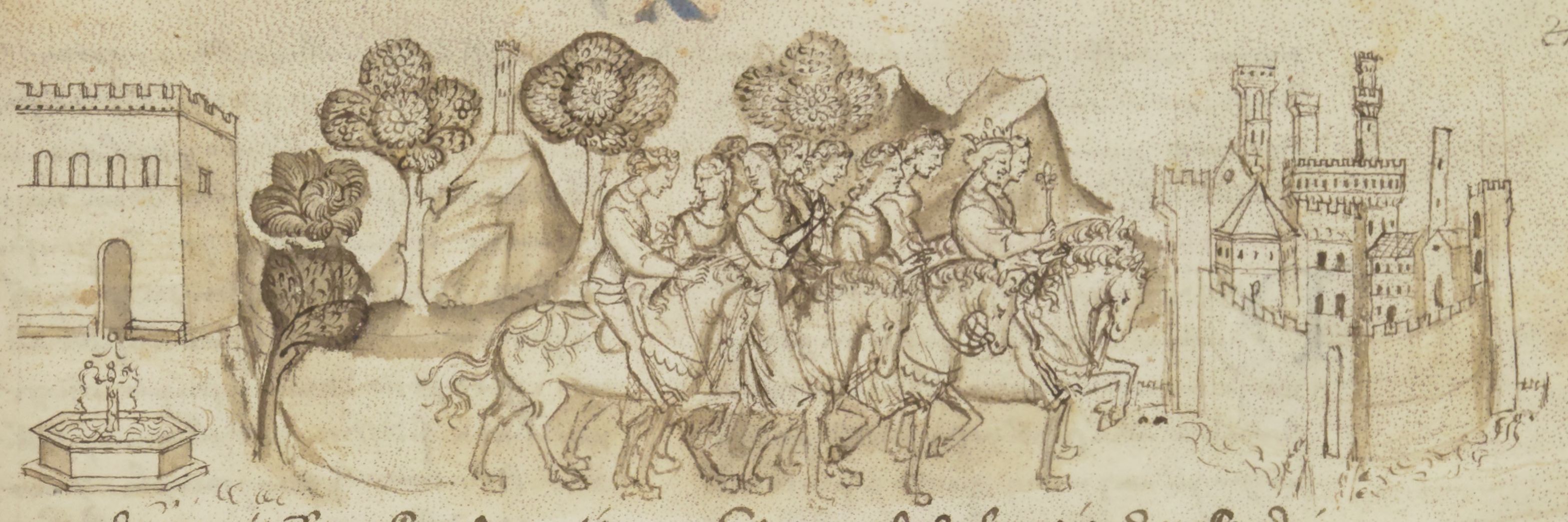Parigi, Bibliothèque Nationale de France, It. 482, f. 214r. Il copista del manoscritto è Giovanni d'Agnolo Capponi. La compagnia dei giovani novellatori lascia la villa fiesolana e torna a cavallo verso Firenze.