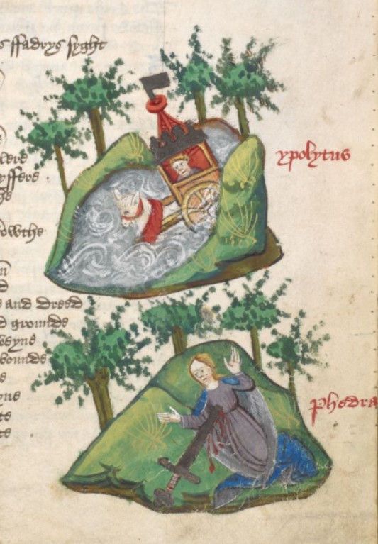 Londra, British Library, Harley 1766, f. 39r. Ippolito cade in un lago con il suo carro; Fedra si getta su una spada compiendo il suicidio.