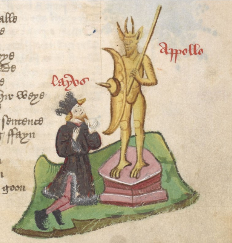 Londra, British Library, Harley 1766, f. 43r. Laio prega inginocchiato dinanzi una statua di Apollo.