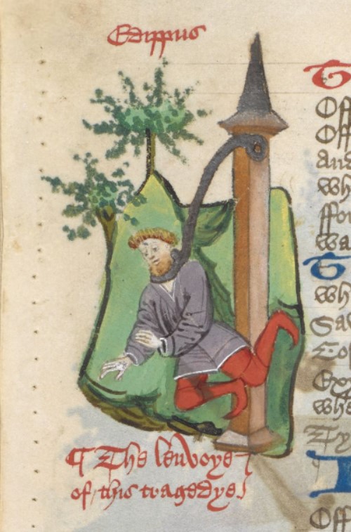 Londra, British Library, Harley 1766, f. 50v. Edipo incatenato ad un palo per il collo.