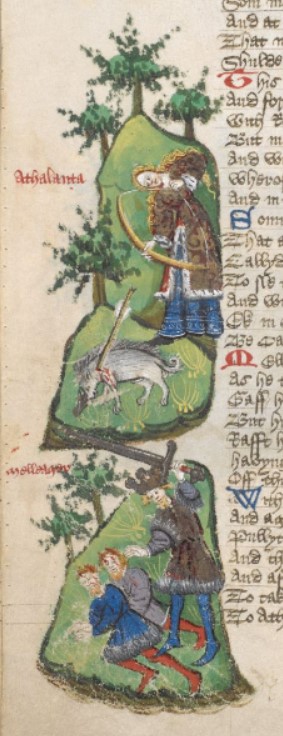 Londra, British Library, Harley 1766, f. 63v. Atalanta uccide il cinghiale calidonio con una freccia; Meleagro uccide i suoi due zii.