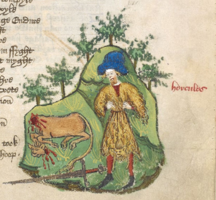 Londra, British Library, Harley 1766, f. 68r. Ercole, vestito di una pelle di leone, decapita il toro di Creta.
