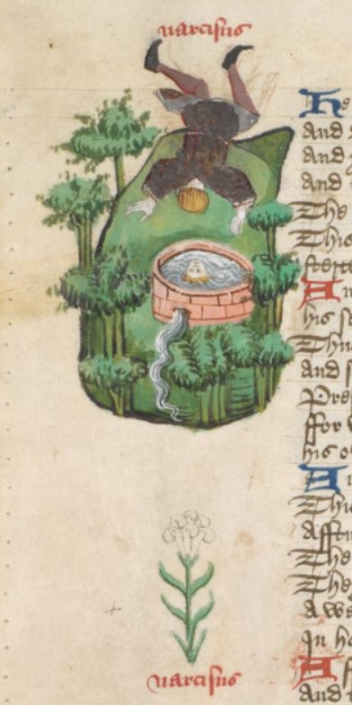 Londra, British Library, Harley 1766, f. 74v. Narciso cade nella fonte dove è riflessa la sua immagine; in basso, il fiore che da lui prende il nome.