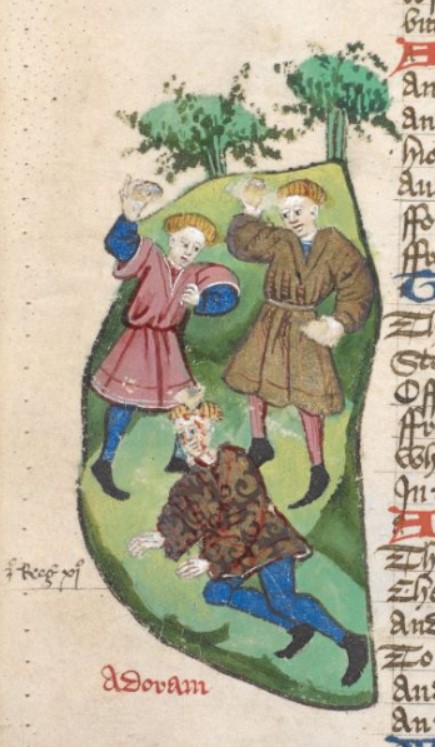 Londra, British Library, Harley 1766, f. 97v. Adoram viene lapidato dagli Israeliti.