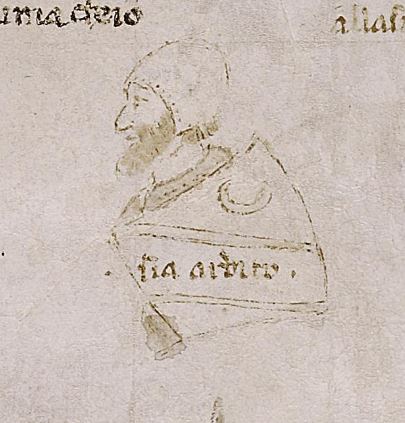 Berlino, Staatsbibliothek – Preußischer Kulturbesitz, Hamilton 90, f. 55v. Manoscritto autografo di Giovanni Boccaccio. Busto di un armigero della Signoria di Brescia, in corrispondenza del richiamo "sia ardito".