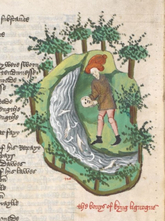 Londra, British Library, Harley 1766, f. 146r. Un uomo getta le ossa di Licurgo nel mare (rappresentato come un fiume).
