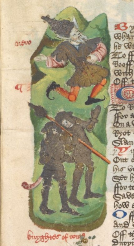 Londra, British Library, Harley 1766, f. 171v. Due soldati inseguono Nerone, raffigurato con due orecchie d'asino.