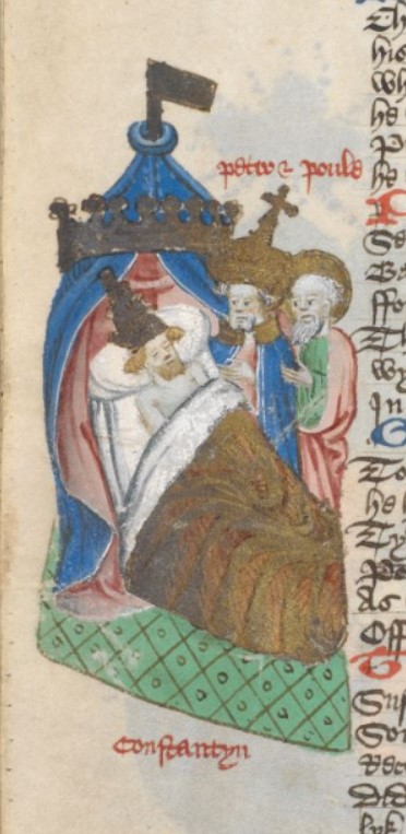 Londra, British Library, Harley 1766, f. 196v. San Pietro e San Paolo appaiono a Costantino, che giace malato nel letto.