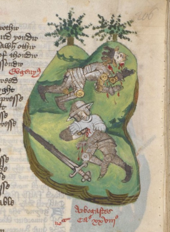 Londra, British Library, Harley 1766, f. 206r. Flavio Eugenio viene decapitato e Arbogaste si suicida con un pugnale.