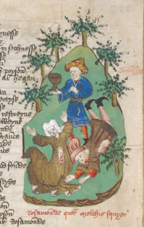 Londra, British Library, Harley 1766, f. 222r. La regina Rosmunda e lo scudiero Elmichi muoiono avvelenati; un servitore reca la coppa di vino avvelenato.