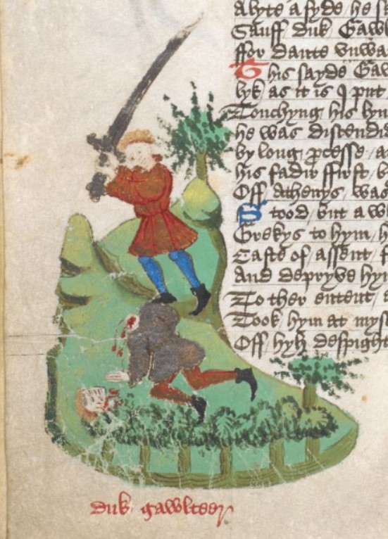 Londra, British Library, Harley 1766, f. 252v. Gualtieri V di Brienne, duca d'Atene, viene decapitato.