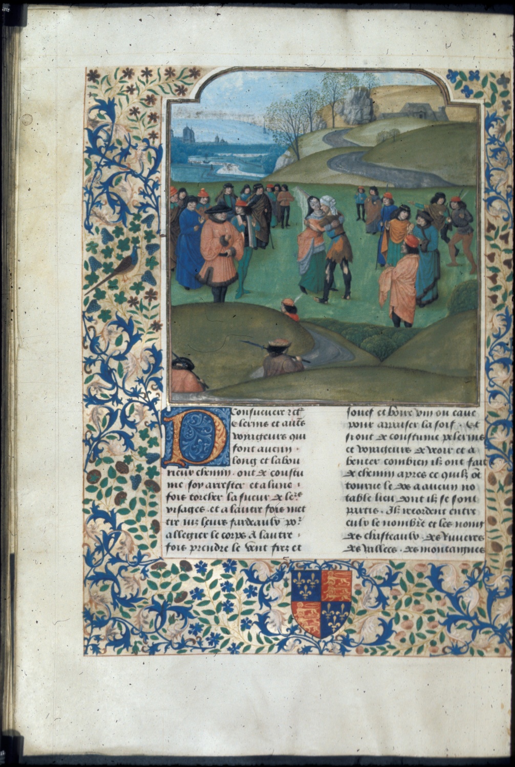 Londra, British Library, Royal 14 E V, f. 113v. Un gruppo di uomini osserva la Povertà, rappresentata come un vecchio in abiti laceri, lottare contro la Fortuna, raffigurata come una dama in abiti eleganti.