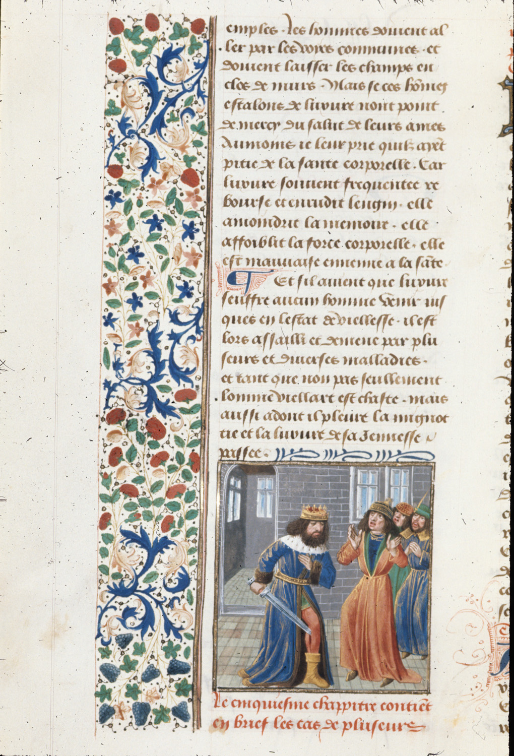 Londra, British Library, Royal 14 E V, f. 132v. Cambise si pugnala in una gamba di fronte a tre cortigiani.