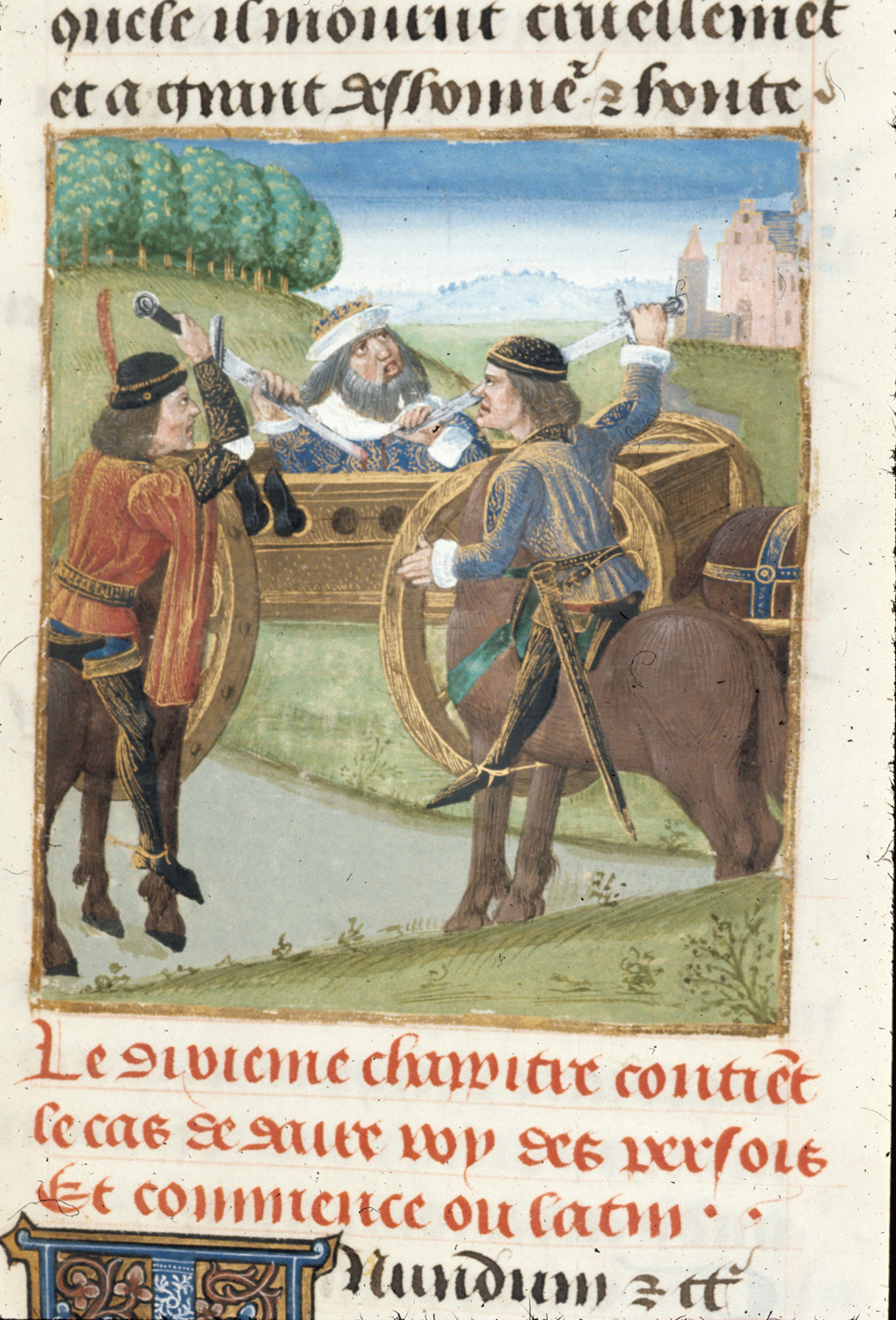 Londra, British Library, Royal 14 E V, f. 192r. Mentre viaggia su un carro Dario I di Persia viene assassinato da due sicari a cavallo.