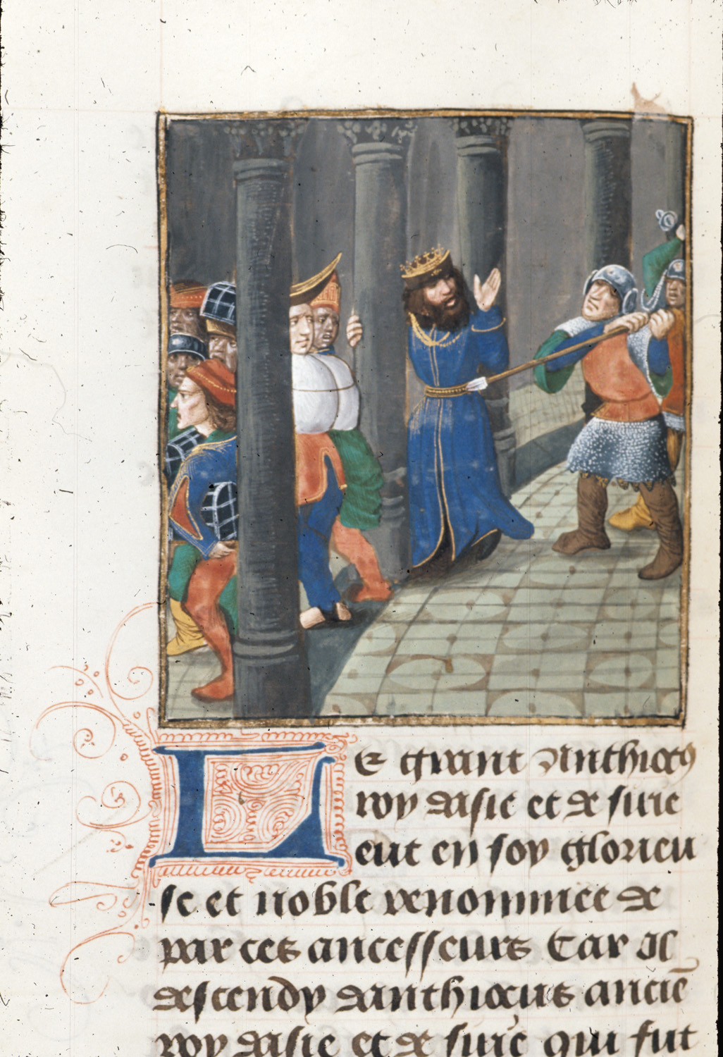 Londra, British Library, Royal 14 E V, f. 256v. Antioco III viene ucciso mentre tenta di saccheggiare il tempio di Giove a Babilonia.