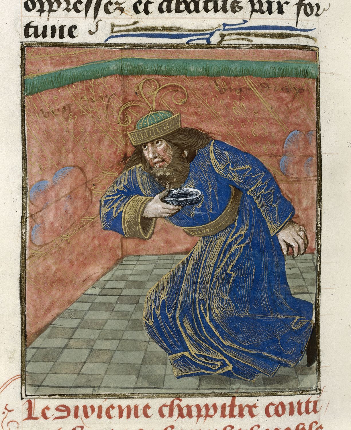 Londra, British Library, Royal 14 E V, f. 263v. Annibale si suicida bevendo il veleno.