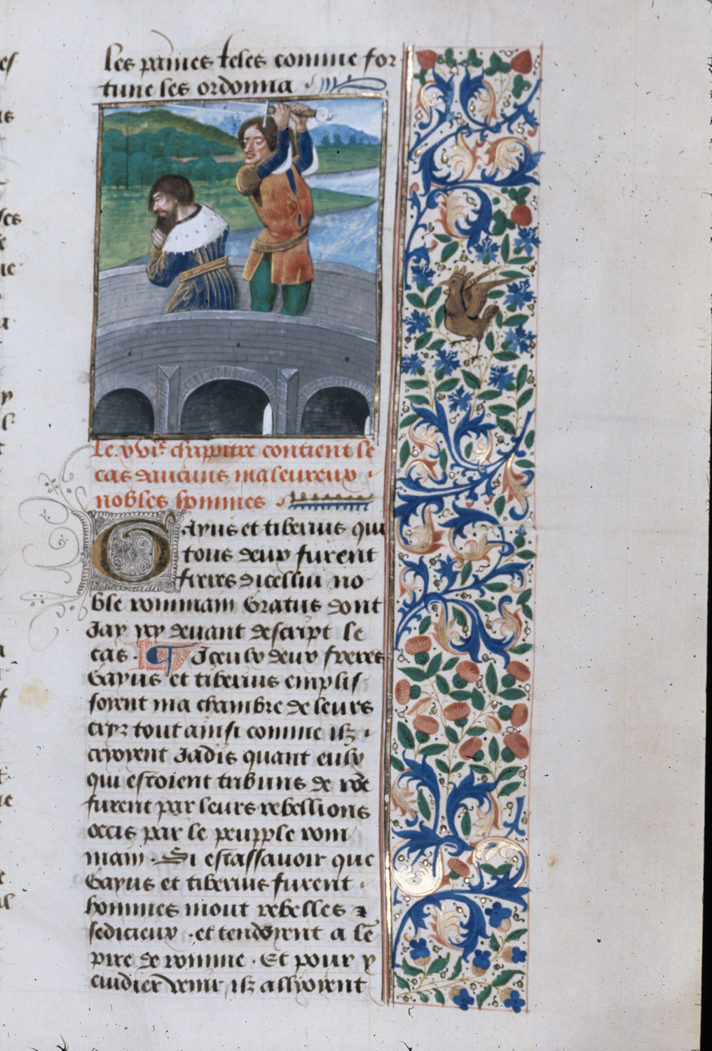 Londra, British Library, Royal 14 E V, f. 277r. Caio Gracco viene decapitato su un ponte.