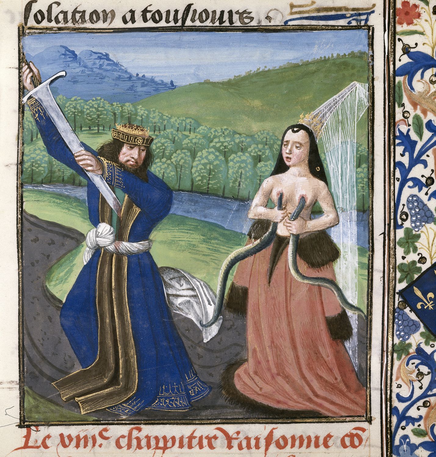 Londra, British Library, Royal 14 E V, f. 339r. Marco Antonio si suicida trafiggendosi con la spada e Cleopatra si fa mordere da due aspidi velenosi.