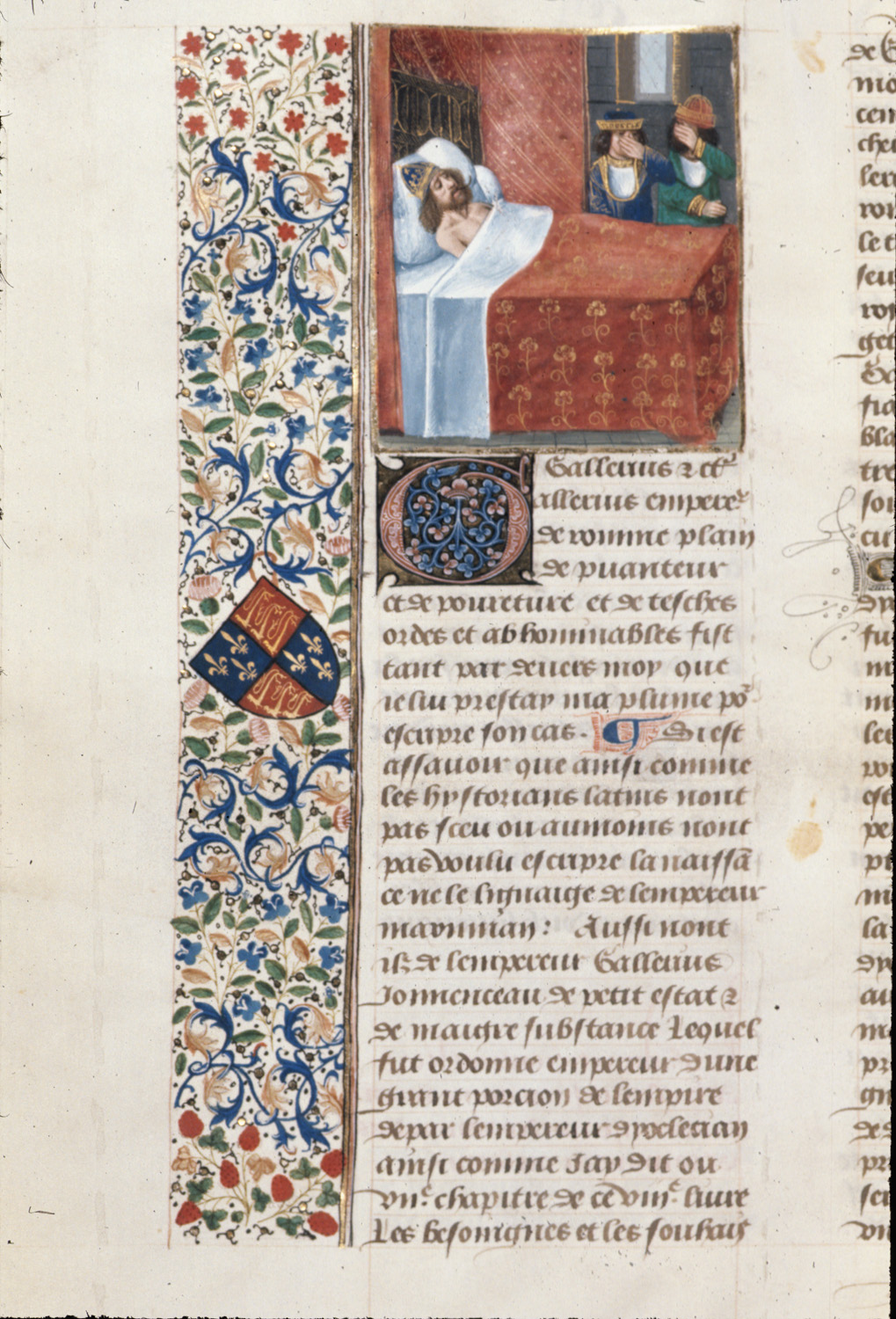 Londra, British Library, Royal 14 E V, f. 413v. L'imperatore Galerio giace a letto morente colpito dalla cancrena, mentre due servitori vicini si turano il naso per sfuggire al fetore del corpo.