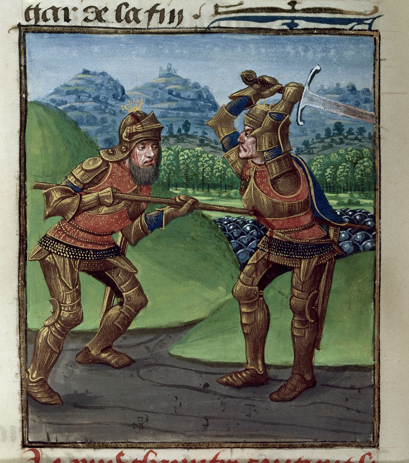 Londra, British Library, Royal 14 E V, f. 439v. Mordred uccide re Artù trafiggendolo con una lancia.