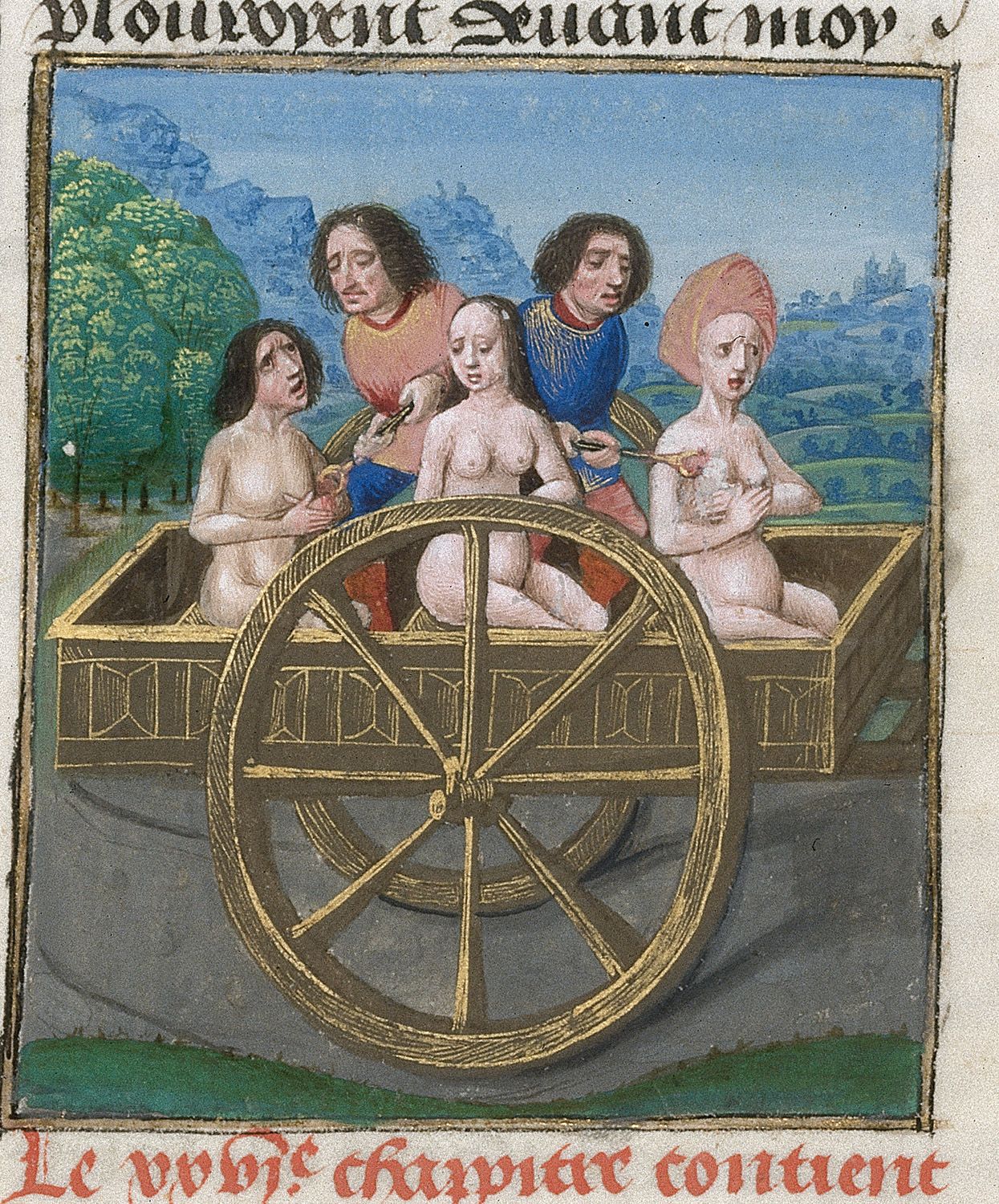 Londra, British Library, Royal 14 E V, f. 506v. Filippa da Catania e i suoi due figli vengono torturati sul carro che li conduce al luogo dove saranno giustiziati.
