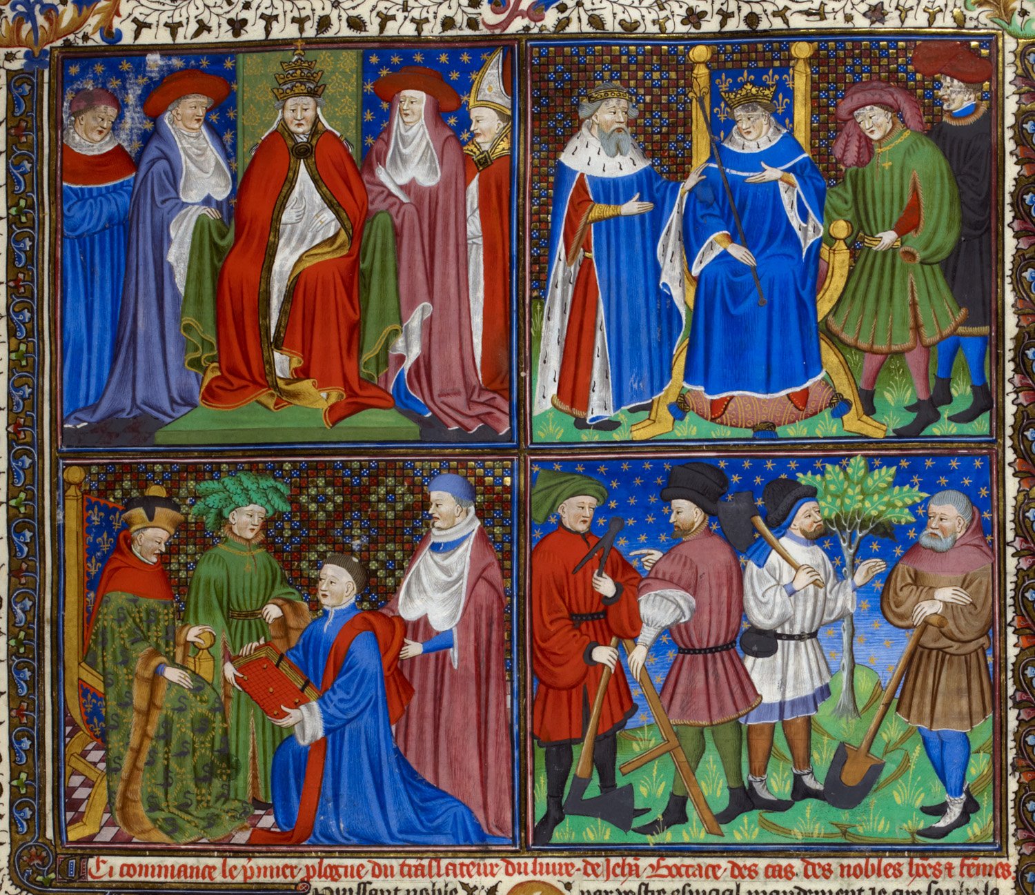 Maestro di Talbot (1440 c.), Il clero; i nobili; Laurent de Premierfait presenta il libro al duca di Berry; artigiani e contadini