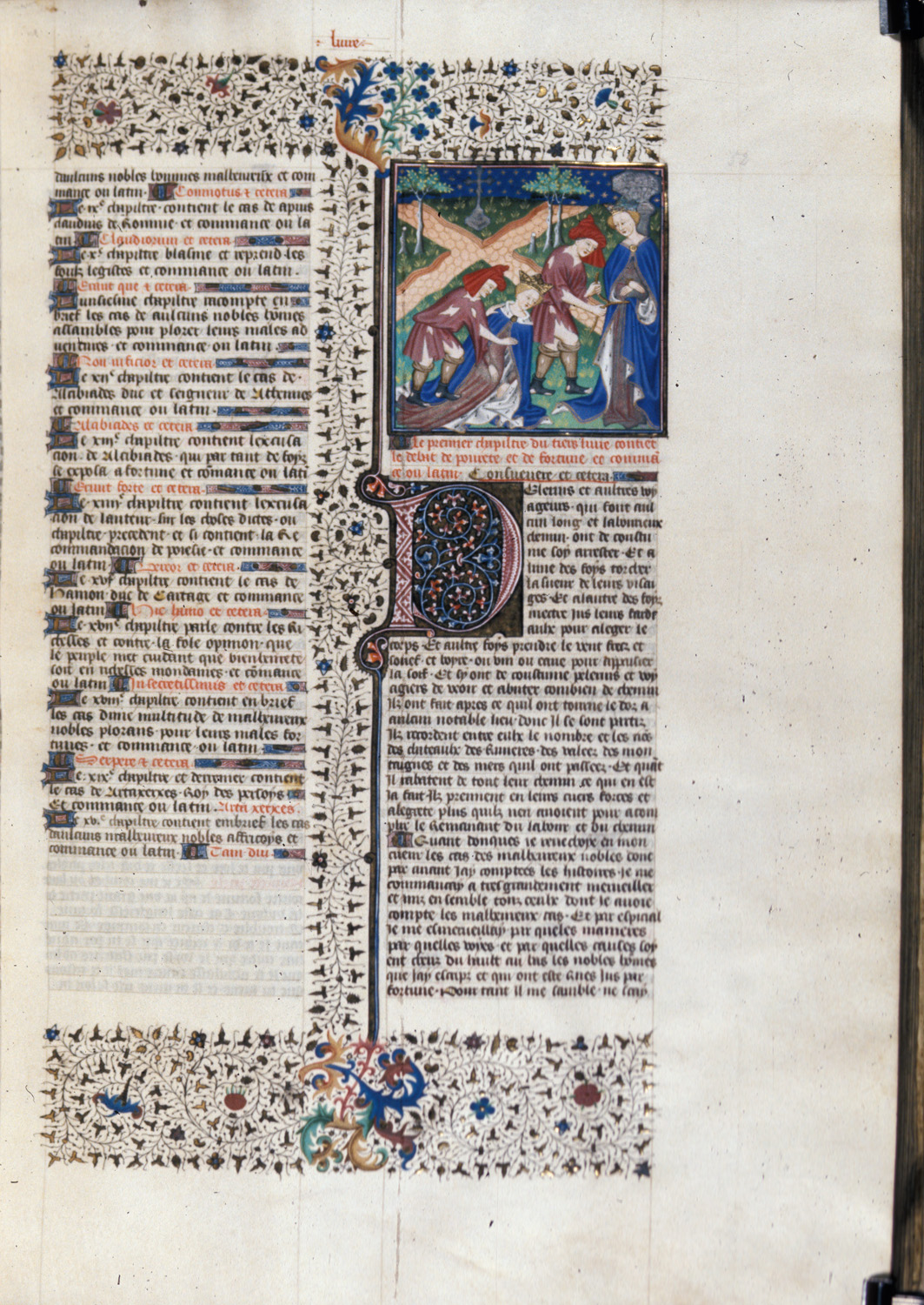 Londra, British Library, Royal 18 D VII, f. 52r. La Povertà, rappresentata come un uomo in abiti laceri, lotta ad un crocevia con la Fortuna, raffigurata come una dama dalle vesti eleganti; la Povertà lega la Fortuna ad una colonna.