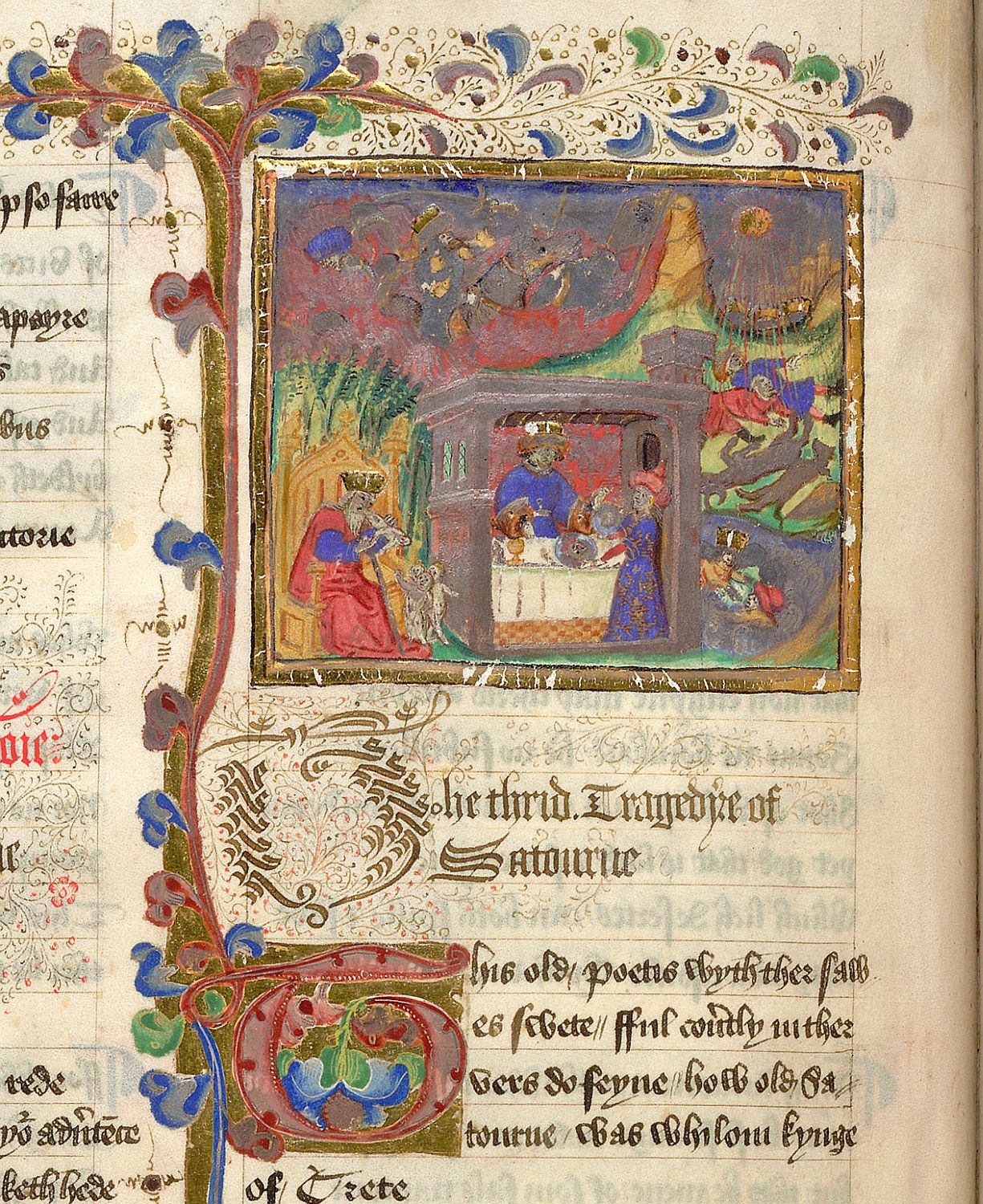 Londra, British Library, Sloane 2452, f. 3v. Saturno, seduto su un trono, divora i suoi figli neonati; all'interno di una stanza Erisittone siede a tavola mentre una donna gli serve delle pietanze; Ogige e un altro personaggio durante l'inondazione (?); Fetonte brucia la terra passando troppo vicino con il carro del sole, causando la morte di uomini e capi di bestiame; l'esercito egiziano annega tentando di attraversare il Mar Rosso.