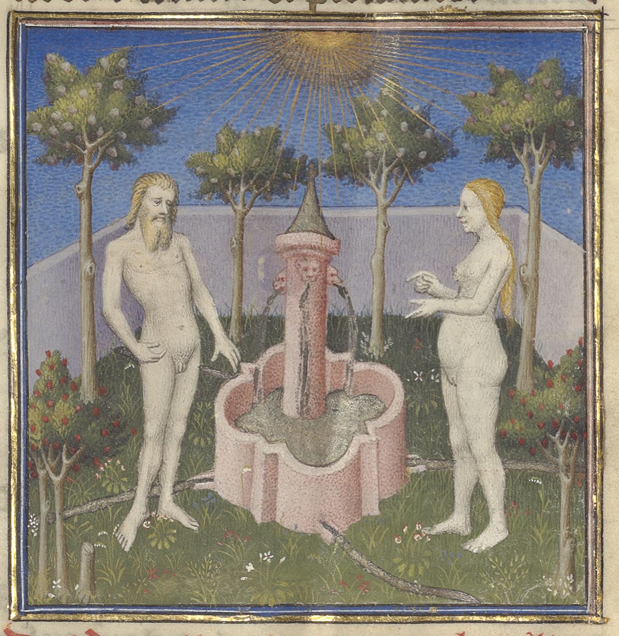 Parigi, Bibliothèque de l'Arsenal, 5193, f. 8v. Adamo ed Eva si trovano nel Giardino dell'Eden accanto ad una fontana.