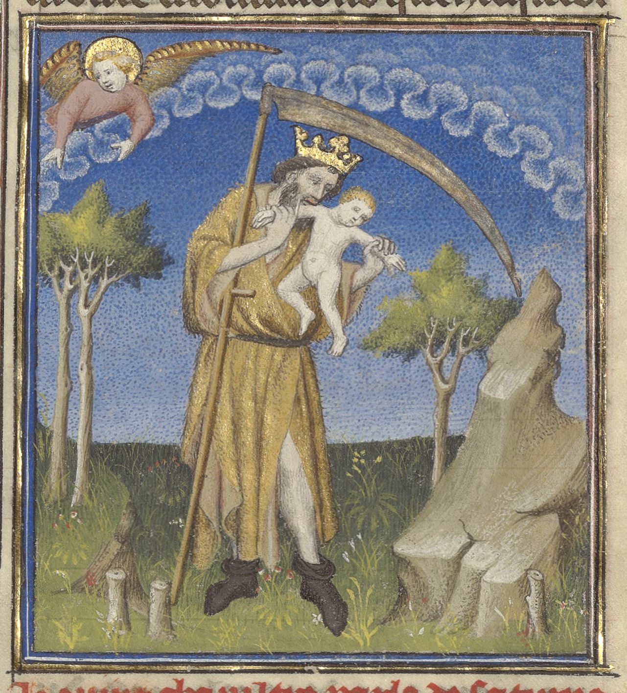 Parigi, Bibliothèque de l'Arsenal, 5193, f. 13r. Saturno, reggendo una falce con il braccio, divora uno dei suoi figli neonati; in alto, un angelo si affaccia dalle nubi.