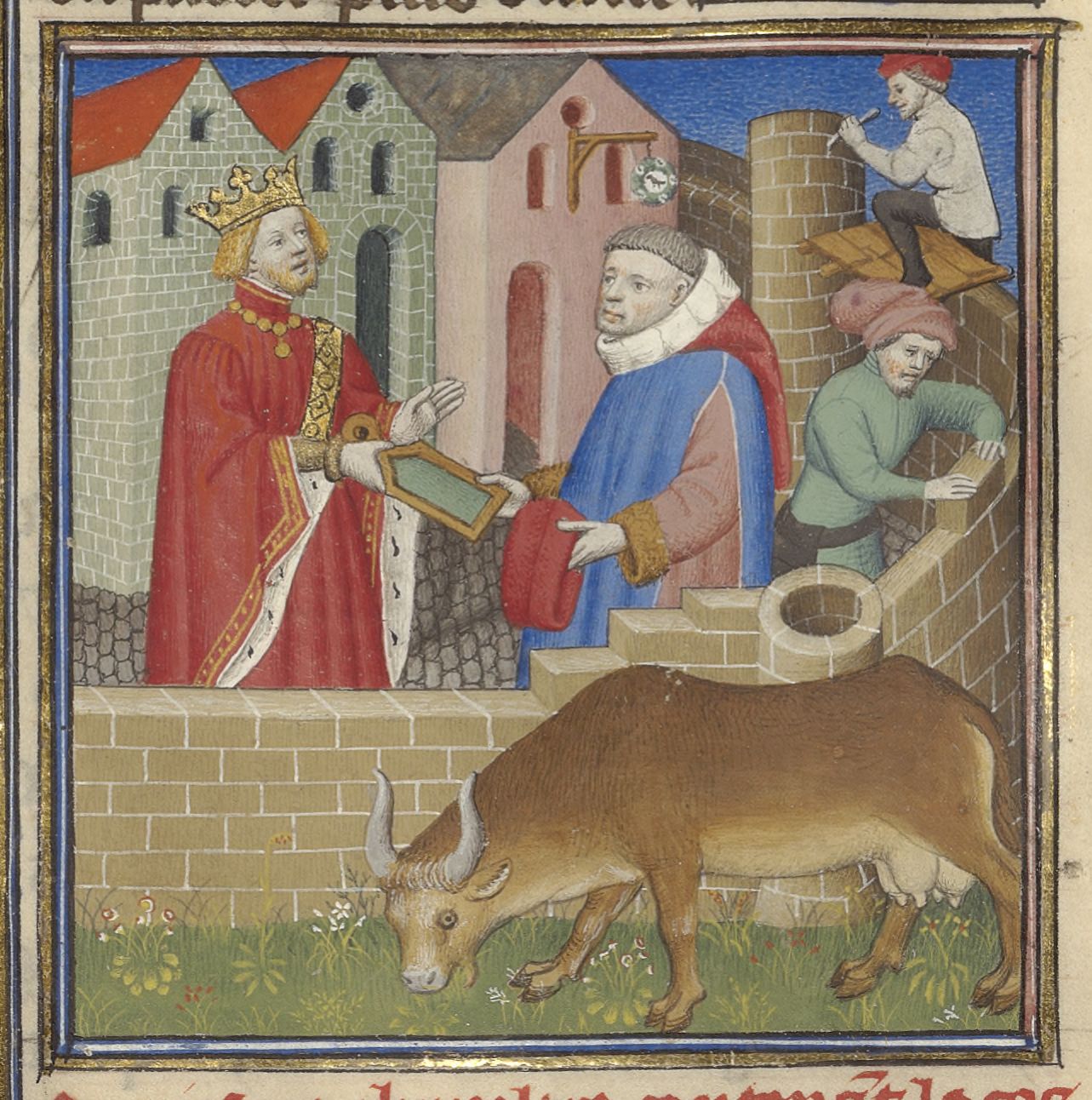 Parigi, Bibliothèque de l'Arsenal, 5193, f. 16v. Cadmo segue la vacca indicata dall'oracolo e nel punto in cui questa si ferma fa erigere la città di Tebe, insegnando agli abitanti la scrittura.