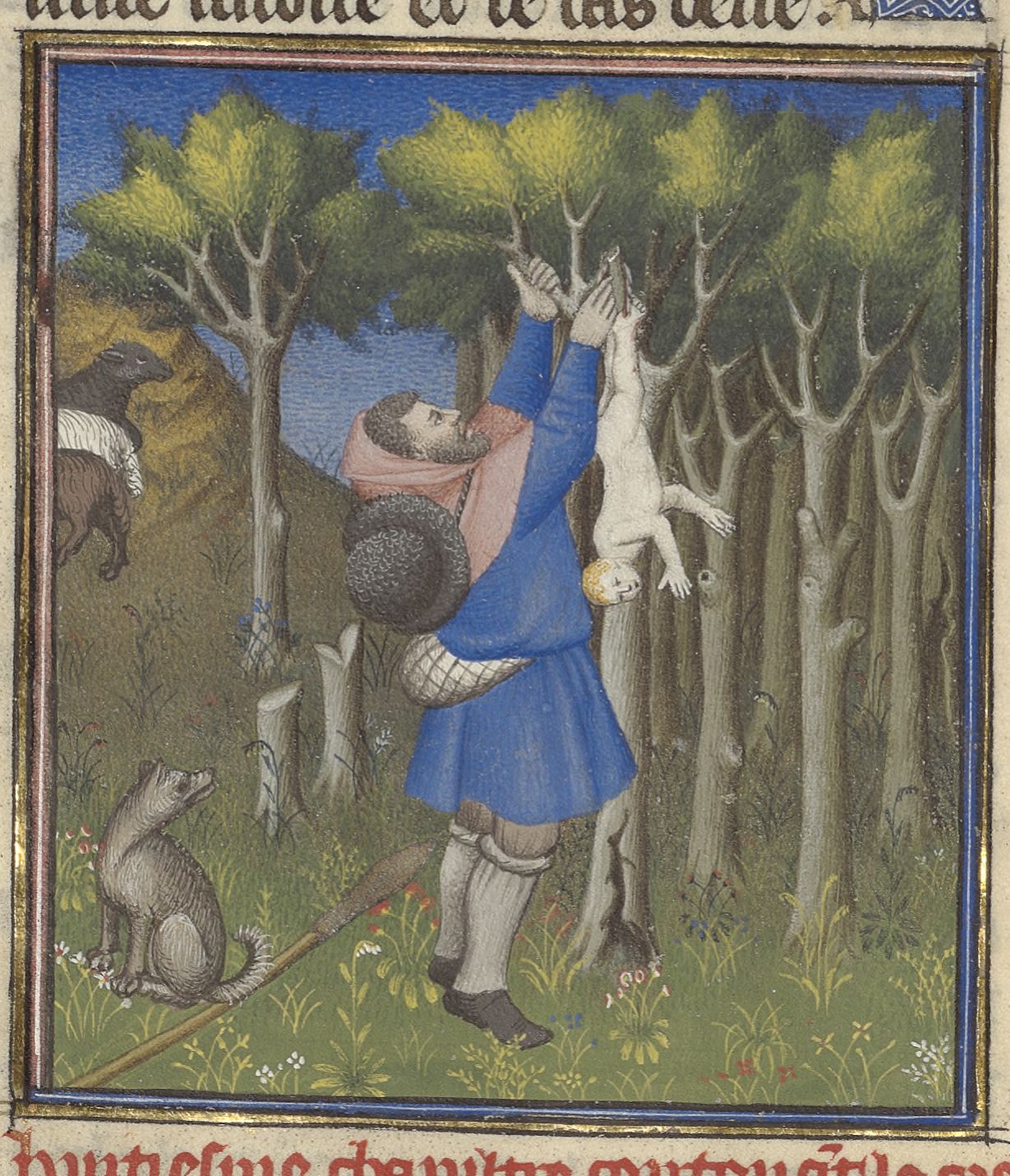 Parigi, Bibliothèque de l'Arsenal, 5193, f. 19v. Il pastore Forbante slega il piccolo Edipo, appeso ad un albero per i piedi, per portarlo con sé.