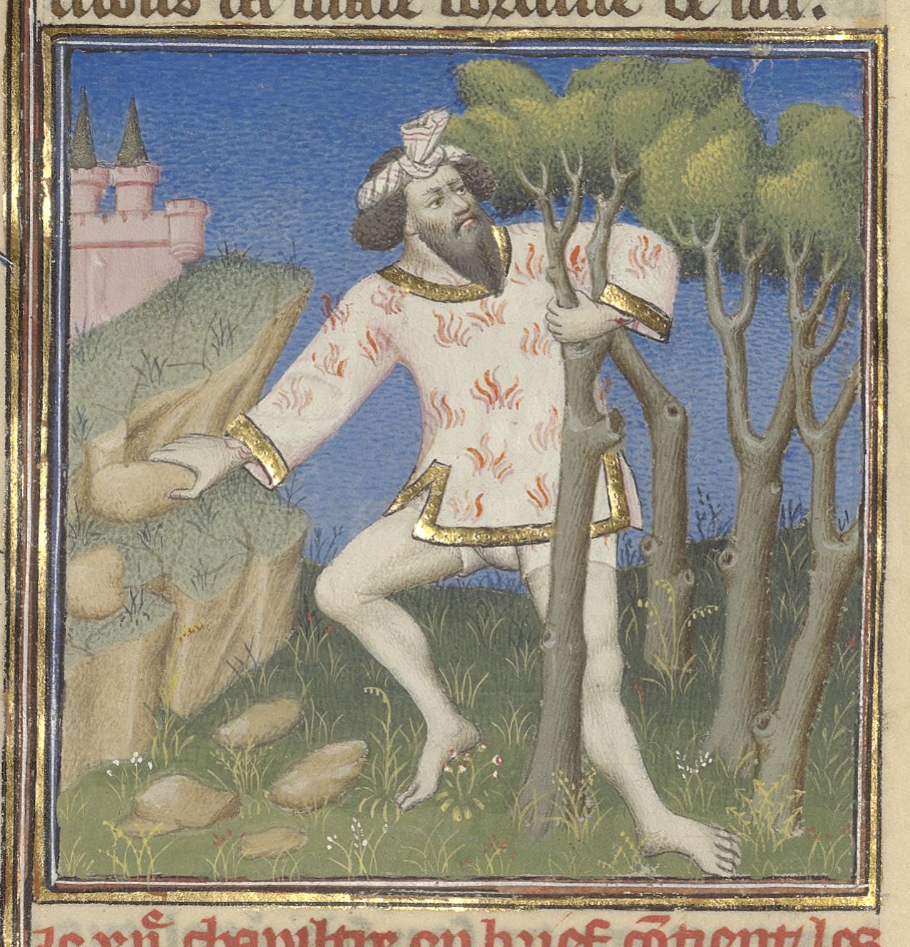 Parigi, Bibliothèque de l'Arsenal, 5193, f. 27v. Ercole brucia per aver indossato la tunica impregnata del sangue di Nesso donatagli da Deianira.